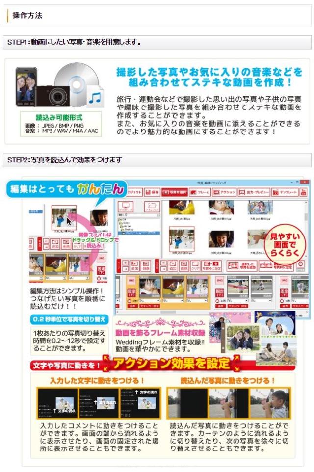 写真・動画にウェディング」は、披露宴の為のフォトームービー・スライドショーを作成したり、結婚式・披露宴の時に撮り溜めた大事な思い出の写真を動画にできるソフトです。結婚式の時のたくさんの思い出の写真や記念写真と音楽を合わせてスライドショーにして流したり、素敵な動画を作成してプレゼントするなど写真を動画の形で保存しておくことができます。また、たくさんの素材が収録されていますので、ウェディング用の素材で写真を綺麗に装飾することもできます。詳細はホームページ(http://www.de-net.com)をご覧下さい。