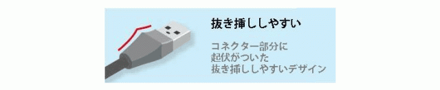 起伏のついた持ちやすいコネクターなので手にした時に挿し方向が直感的にわかります。コネクターの起伏が指にかかり、弱い力でも抜き挿ししやすいコネクターデザインです。