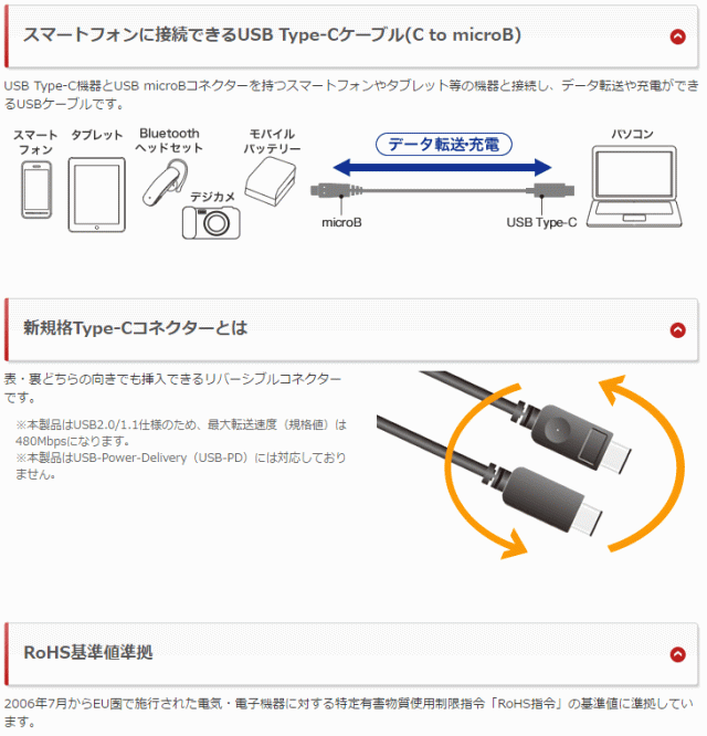| USB2.0ケーブル(MicroB to C) 2.0m ブラック BSUMBC220BK スペック情報 | |