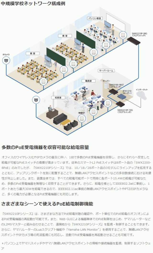 給電仕様としてIEEE802.3atに準拠し、1ポートあたり最大30Wを給電できるので、IEEE802.11ac準拠の無線LANアクセスポイントやPTZのIPカメラなど、多くの電力が必要となるPoE受電機器にも対応します。