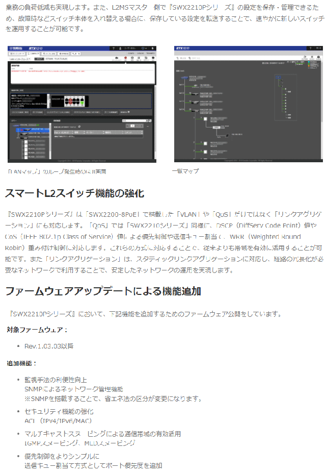 | 管理/設定 | プログラム管理:TFTPによる更新 Web GUIによる更新 ロギング機能:メモリに蓄積 SYSLOGでの出力 定期的なログのバックアップ機能 L2MSマスターへのイベント出力 |