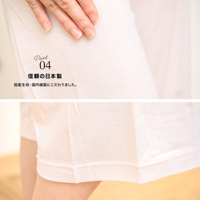 アウトステッチ製法で、可能な限り肌に縫い目や縫い代があたらないように仕立て上げられた、着心地重視でシンプルなデザインです。