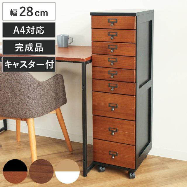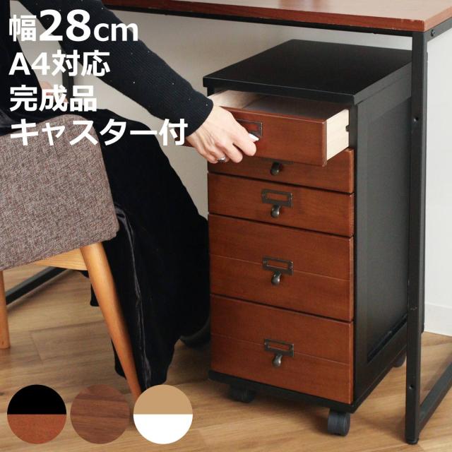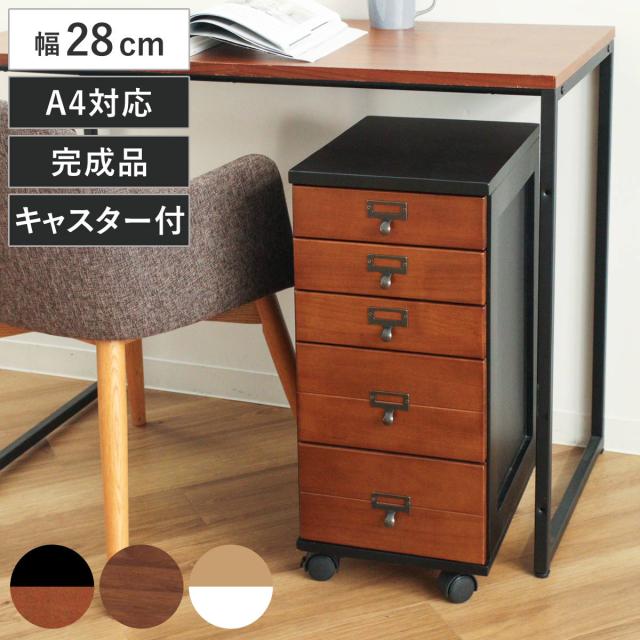 幅28cmのスリム設計で、リビングや書斎、廊下などの限られたスペースにも設置しやすいチェストです。5段構造で収納力があり、移動に便利なキャスター付きです。キャスターを取り付けるだけの完成品で、届いたその日からすぐにお使いいただけます。