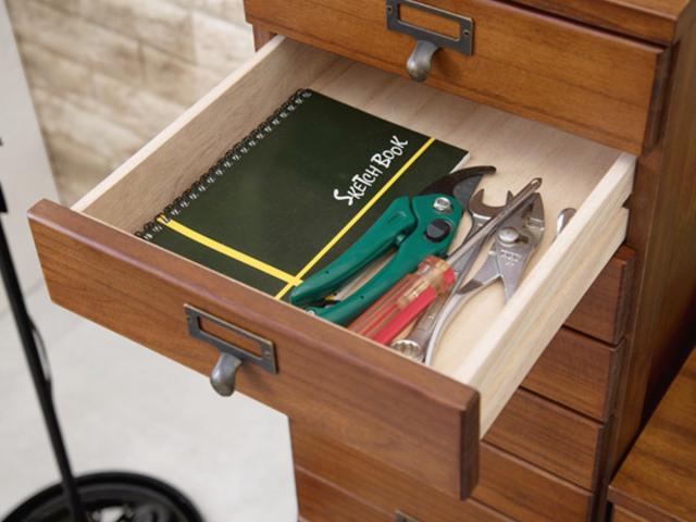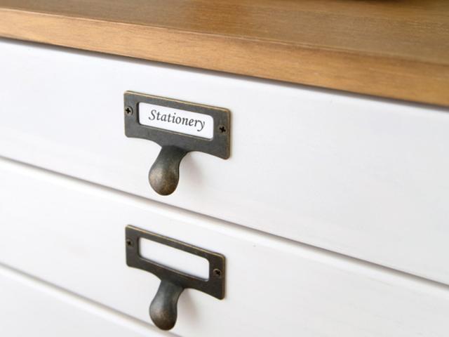 どこに何を収納しているかが分かりやすい、ネームプレート付きの取っ手。つまみやすく、アンティーク風のデザインがチェスト全体のアクセントになります。