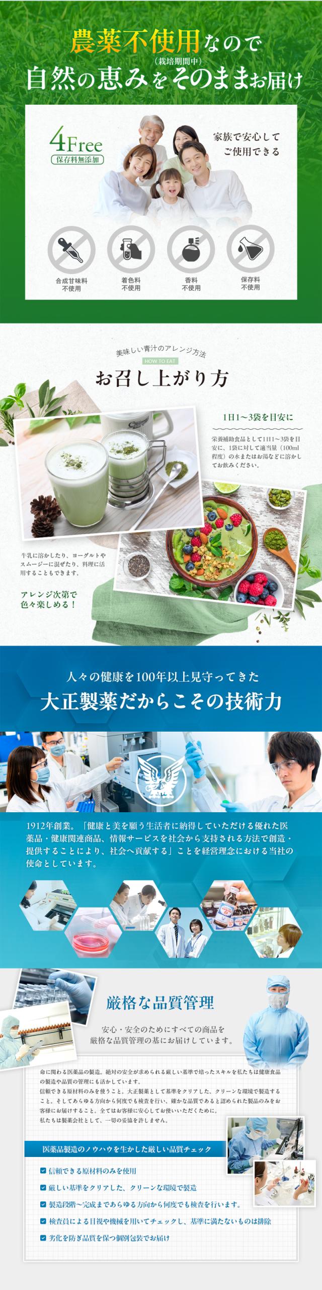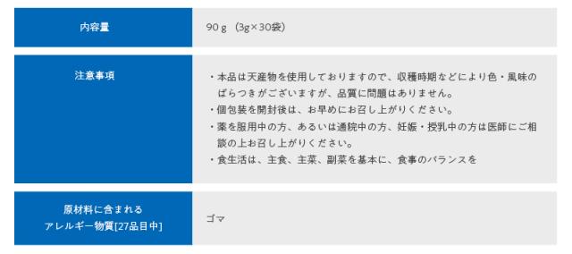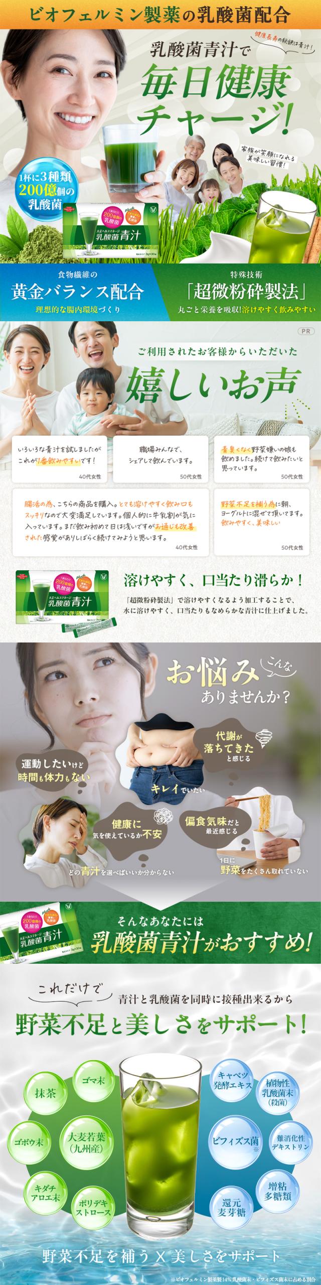 | 原材料名 | 大麦若葉(九州産)、ポリデキストロース、難消化性デキストリン、還元麦芽糖、抹茶、植物性乳酸菌末(殺菌)、ゴボウ末、キダチアロエ末、ゴマ末、キャベツ発酵エキス、ビフィズス菌末(ビオフェルミン製薬製 14%、乳酸菌末・ビフィズス菌末に占める割合)/増粘多糖類 |