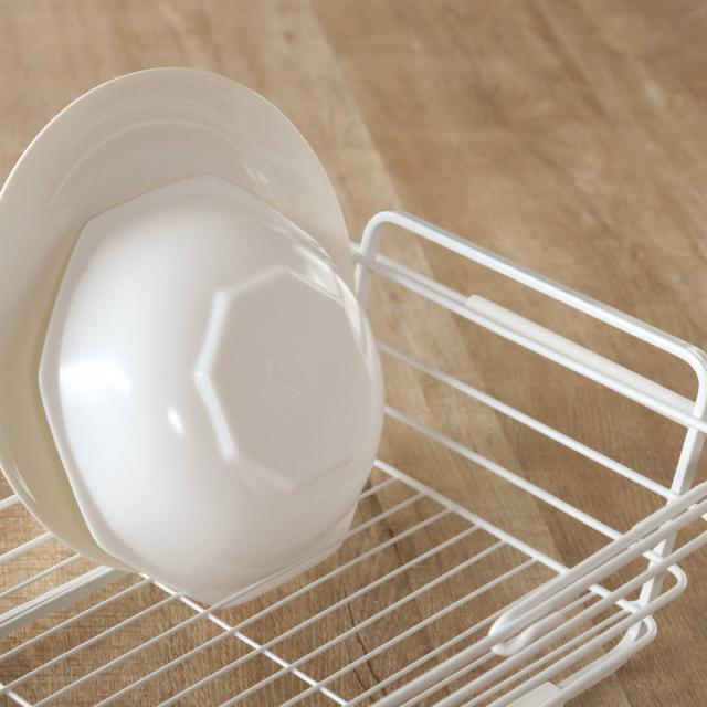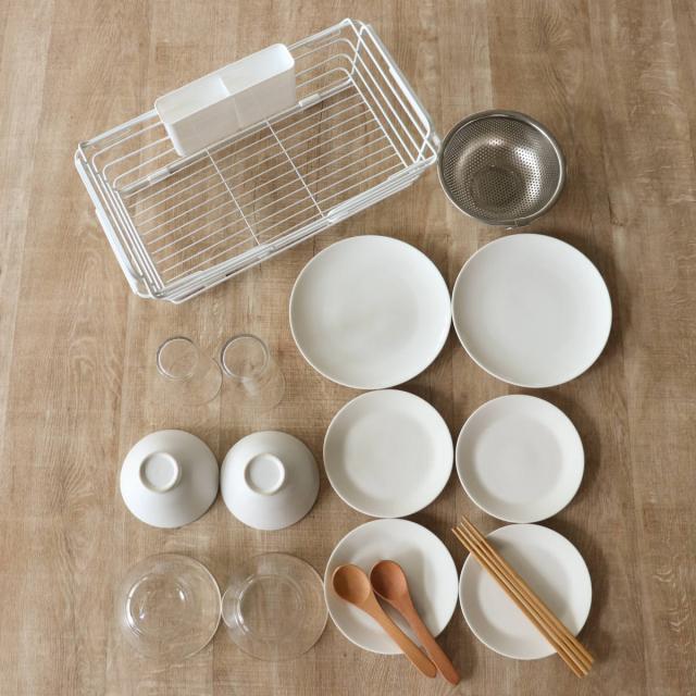 2人分の食器がまとめて入るサイズです。少人数のご家庭では、食器に加えて鍋やフライパン、調理器具もまとめて収納できます。食洗機のサブ水切りとしても使えます。