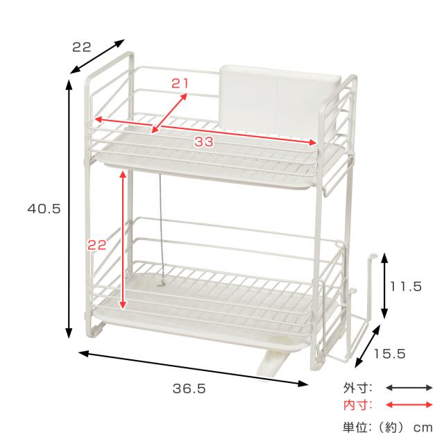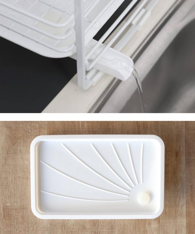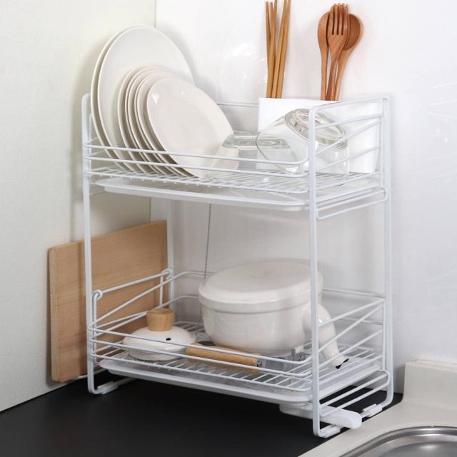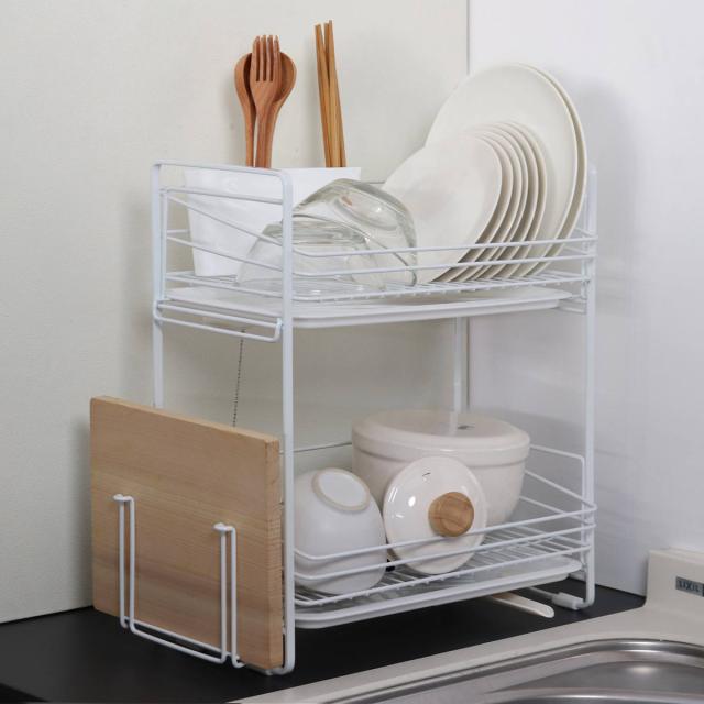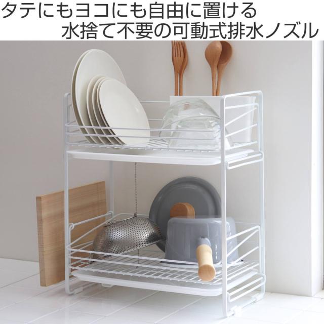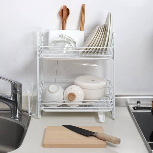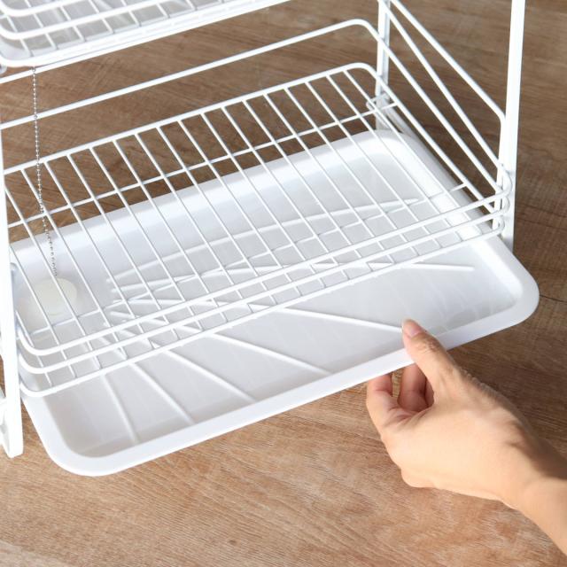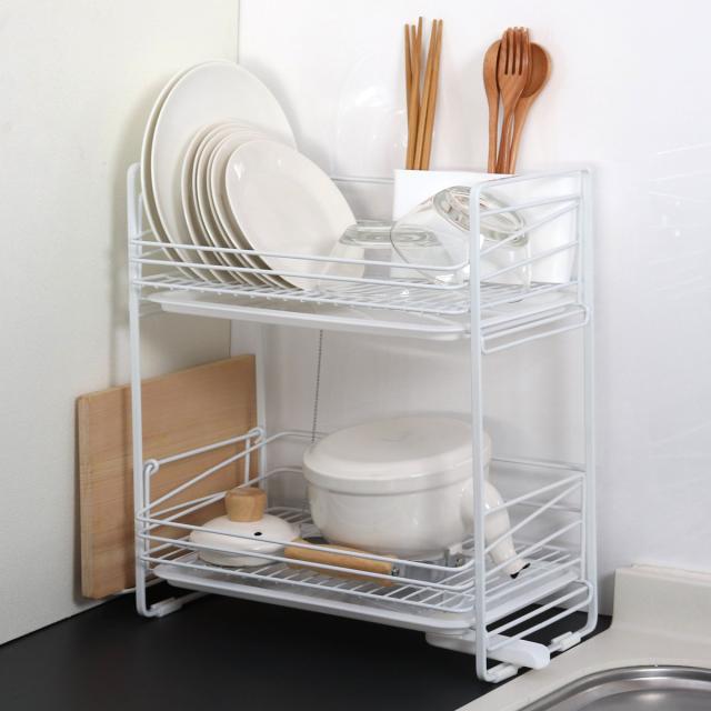 水切りカゴ スリム 水切りラック 2段 シンプルストレージ W ( 水切りかご ディッシュラック 水切りトレー 水切り 洗い物 食器洗い 防サビ加工 自動排水 カトラリーポケット付き シンク横 乾燥 ホワイト 白 キッチン用品 大容量 )