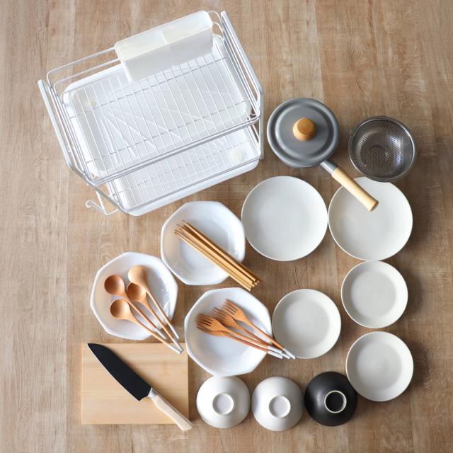 4人分の食器がまとめて入る大容量の2段タイプです。少人数のご家庭では、食器に加えて鍋やフライパン、調理器具もまとめて収納できます。