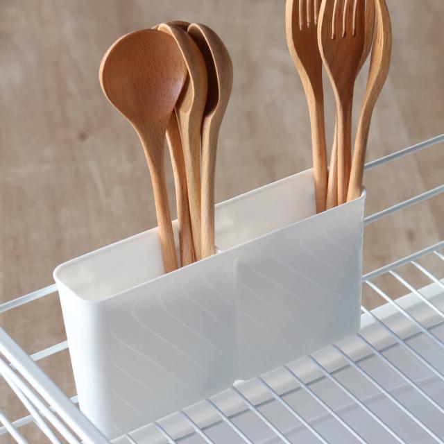 菜箸やお玉などのキッチンツールと長さや大きさの違うお箸やスプーン、フォークなども倒れることなく分けて乾かせる仕切り付きの水切りポケットが付属しています。水切りバスケットの好きな位置に掛けて使えます。