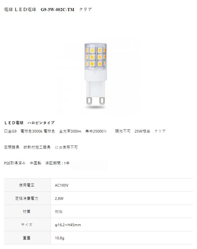 | G9-3W-002C-TM LED電球 電球色 口金G9 25W相当 ハロピンタイプ クリア スペック情報 | |