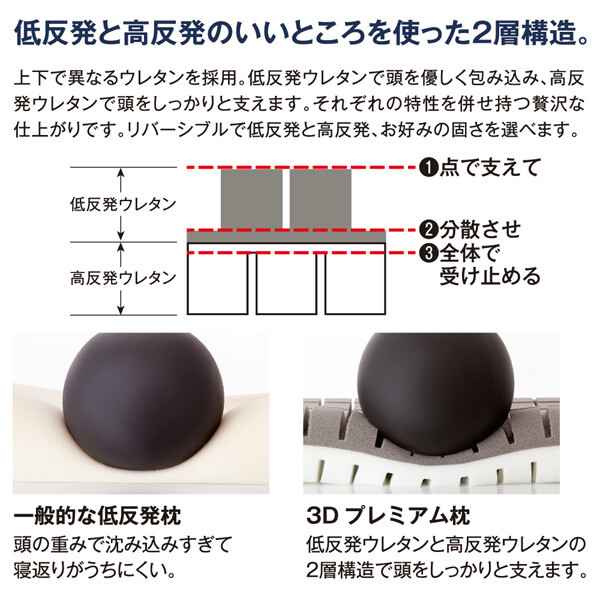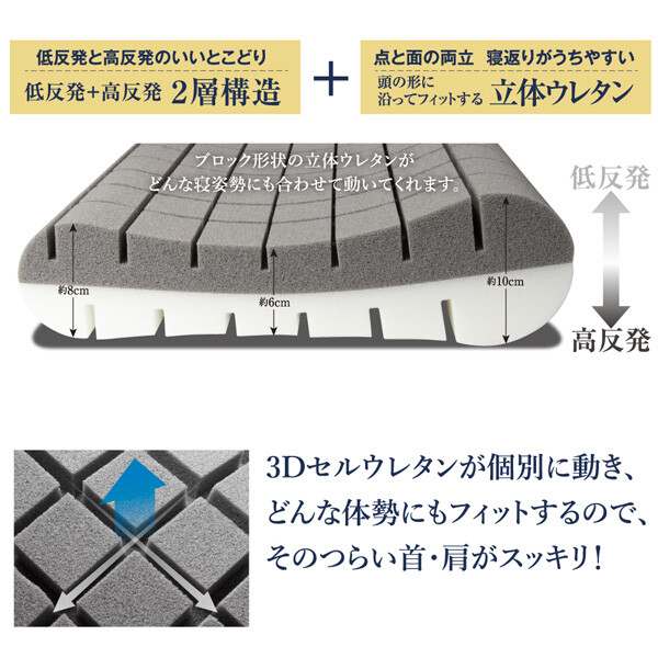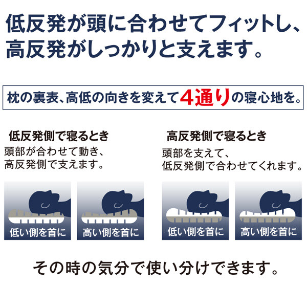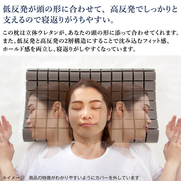 ブロック形状の立体ウレタンが頭の形に沿ってフィット。●低反発と高反発のいいところを使った2層構造。上下で異なるウレタンを採用。枕の表裏、高低の向きを変えて4通りの寝心地を。低反発側で寝るとき:頭部が合わせて動き、高反発側で支えます。高反発側で寝るとき:頭部を支えて、低反発側で合わせてくれます。リバーシブルで低反発と高反発、お好みの固さをその時の気分で使い分けできます。