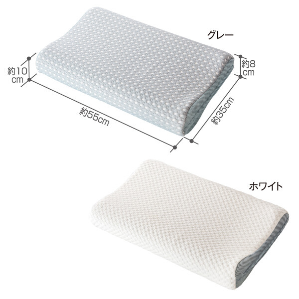 ■カラー:グレー、ホワイト■商品サイズ/重量(約):幅55×奥行35×高さ10cm/600g■材質:[枕カバー]布地部:ポリエステル72%、レーヨン27%、ポリウレタン1% メッシュ部:ポリエステル100%[内カバー]ポリエステル100%[中芯]ポリウレタン■生産国:中国■メーカー名:アルファックス