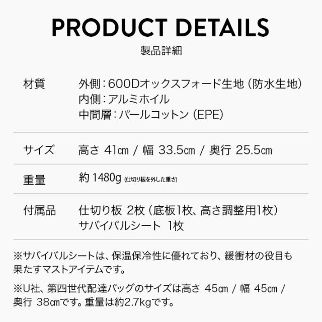 【商品仕様】・外側の素材----600Dオックスフォード ・中間層の素材----パールコットン(EPE)・内側の素材----アルミホイル