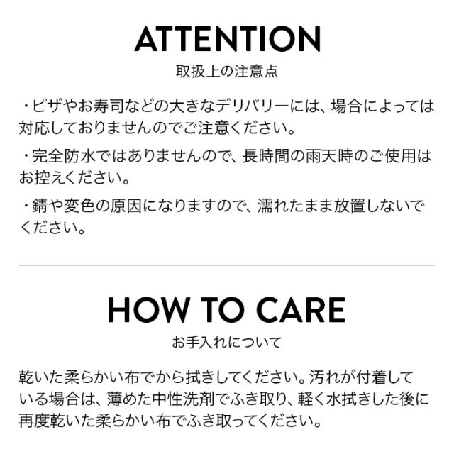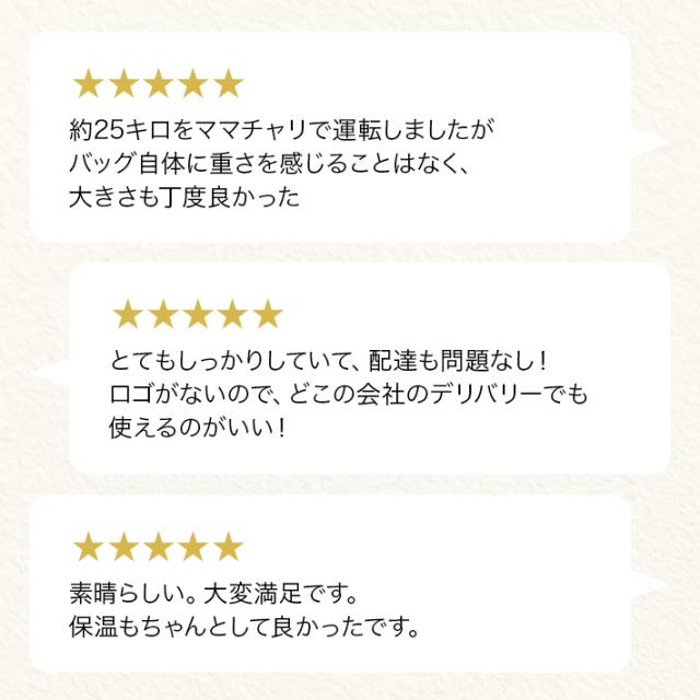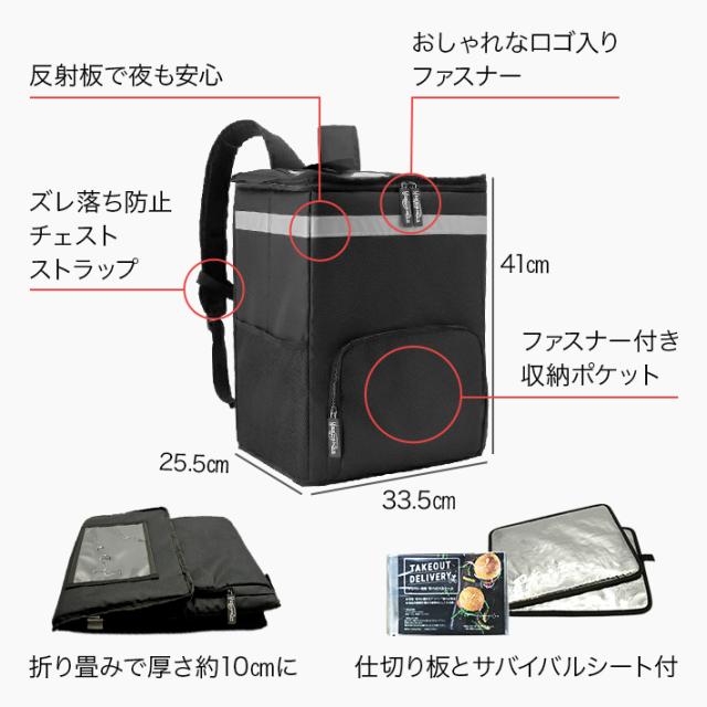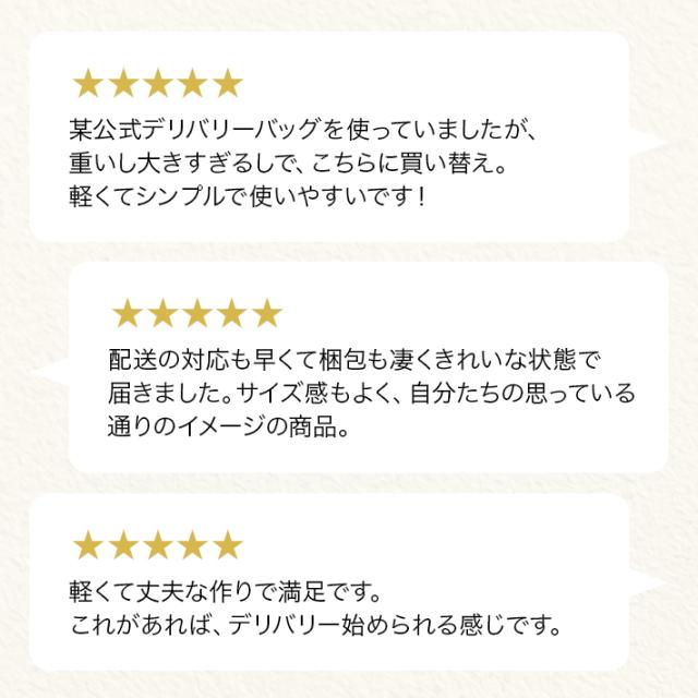 - 注文して次の日に届きました。商品も頑丈でフードデリバリーに最適なバッグだと思います。