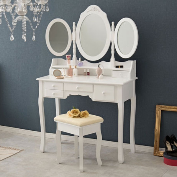 女子の憧れ、三面鏡タイプのドレッサー&スツールです。三面鏡のドレッサーがあれば、メイクやヘアの左右バランスを同時にチェックできるのでワンランク上のスタイリングができます。