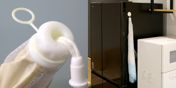 吊り下げリング付きなので、フックに引っ掛ければ場所を取らず吊り下げて収納ができて便利です。