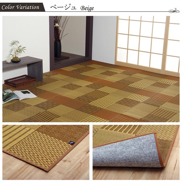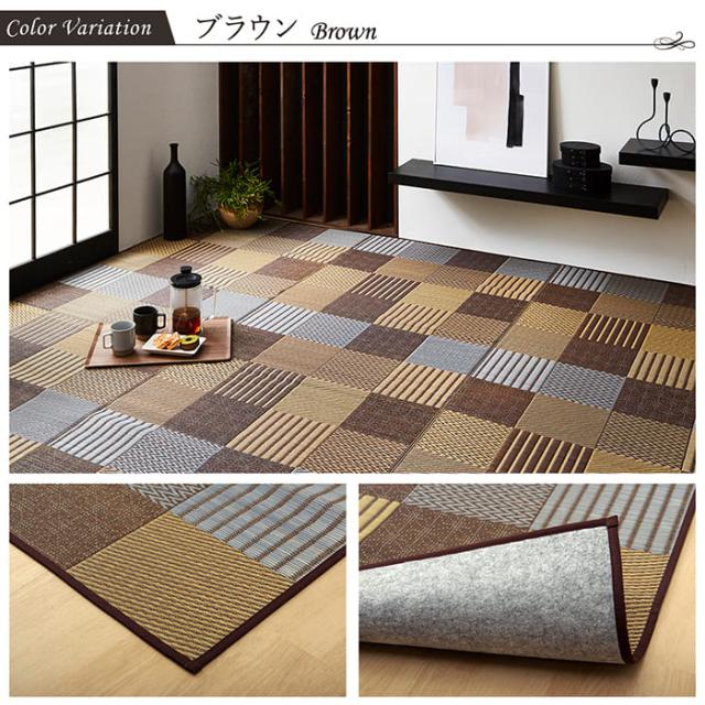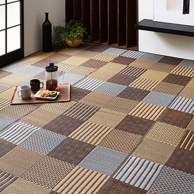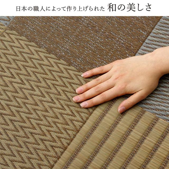 いろいろな織りを組み合わせたパッチワーク風のい草花ござです。カラーバリエーションは、ベージュ(JAN:4956642469780/型番:4114102)、ブルー(JAN:4956642469834/型番:4114202)、ブラウン(JAN:4956642469889/型番:4114302)です。織り方によって違う複数の肌感触をお楽しみ頂けます。落ち着いた色目でモダンな雰囲気に仕上げました。国産(九州産)のい草を使用しています。一本一本が太く、表皮が厚く繊維がキメ細かいので弾力性があり、耐久性に優れています。い草には空気の自然浄化作用、湿度の調節作用などがあります。また汚れにくく、使用するうちに黄金色に変化し味が出ます。い草に青森ヒバ加工を施しています。(抗菌、防臭効果)裏にはフローリングを傷つけにくいよう不織布を貼っています。