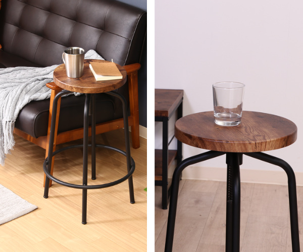 座面の高さを60〜69cmの間で調整できるので、用途や仕様に応じて高さを変更することが出来ます。スツールとしてはもちろん、ソファやベッド横に置いてサイドテーブルとしてもお使い頂けます。