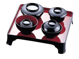 汁椀: 身φ93×H47mm 蓋φ86×H38mm/お膳:260×260×H59mm/材質:木質樹脂/耐熱温度:75度