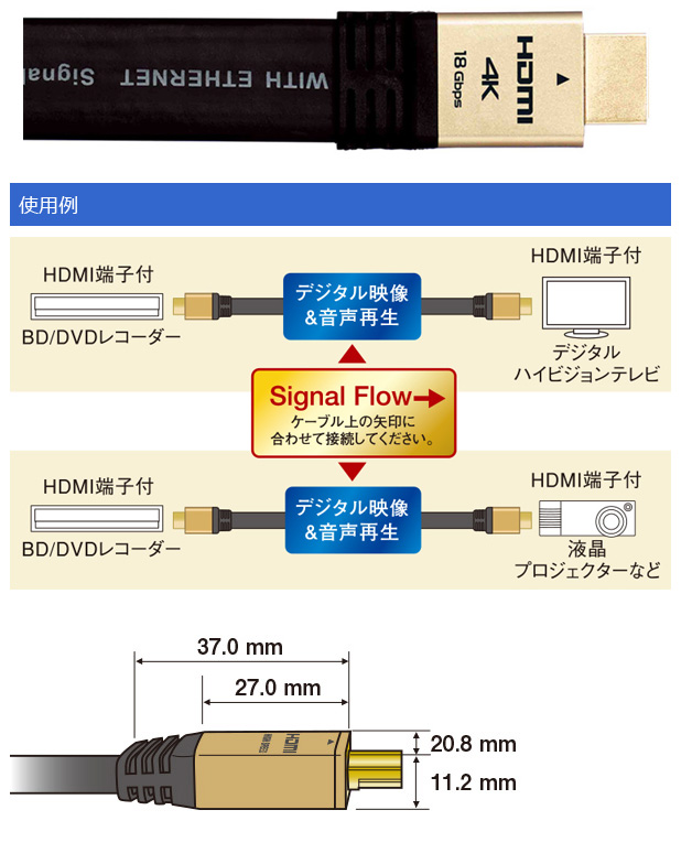 当社プレミアムディーガをはじめ、HDMI ver.2.0規格に準拠した4K60pフルスペック映像※1へのアップコンバートに対応した機器からの出力には、従来の10.2Gbps伝送では不十分です。このケーブルは18Gbps高速伝送に対応し、4K24p(30p)等の映像はもちろん、4K60pフルスペック映像※1までも高画質のまま伝送します。
