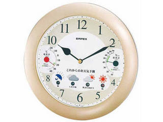 ●品番:BW-5238●サイズ:(約)直径25.0xD4.5cm●カラー:シャンパンゴールド●素材:(外枠材質)PS樹脂塗装仕上●電源:(電池)単3x3個●重量:約750g●仕様:掛け式、(機能)時計・天気予測・温度計・湿度計●原産国:日本