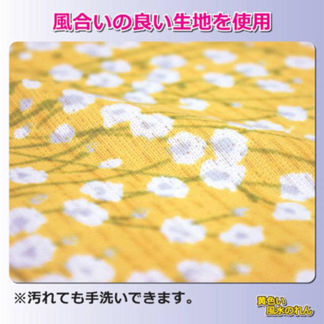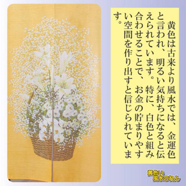 風合いの良い生地を使用した日本製のれん。丈が170センチのロングタイプで、スリットは自由な長さにカットできる。中国では古くから伝わる風水で、黄色は金運・財運を上昇させる色とされています。また、黄色を飾れば元気で幸せな気持ちになるとも言われています。このように風水の中でも特に人気なのが金運・財運を呼ぶとされる黄色。明るく淡い黄色をバックに、さらにお金が貯まると言われる相性の良い白色の5種類の花が描かれています。大きさは、下の方までしっかり隠れる長さ170センチとロングサイズで、真ん中のスリット部分はハサミで好みの長さに切ることができます。汚れたらご家庭で手洗いが可能です。
