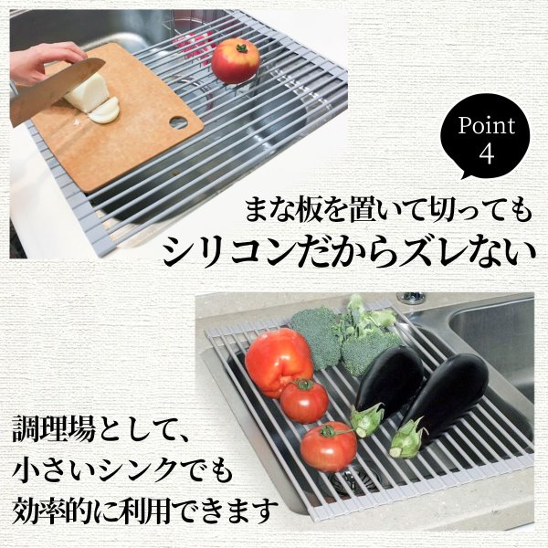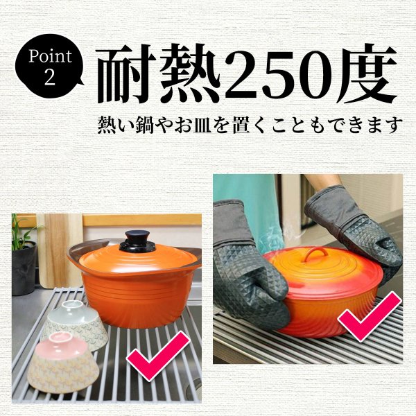 鍋置きとして、まな板置きとして、またペットボトルを逆さに挟んで速乾性を高めるなど多用途でお使いいただけます。ハサミで切ることで洗面所など別の場所でお使いいただくこともでき、ご自身の好みに合わせた使い方が可能です。