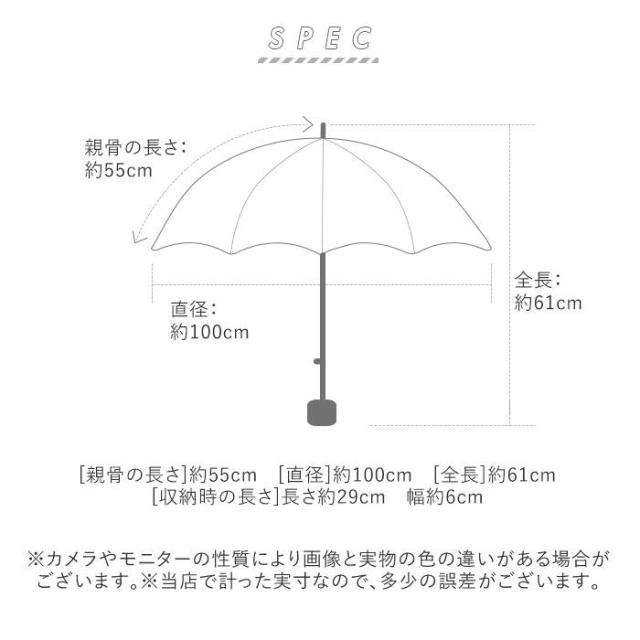 [親骨の長さ]約55cm [直径]約100cm [全長]約61cm [収納時のサイズ]長さ:約29cm 幅:約6cm ※サイズは当店平置き実寸サイズです。実際の商品とは多少の誤差が生じる場合がございます。あらかじめご了承ください。