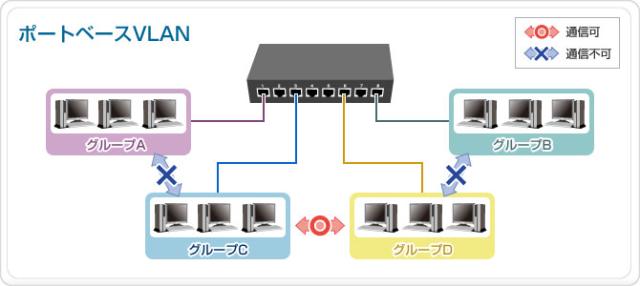 ポート単位に物理的な回線でグループを構成する事ができます。ポートベースVLANによるグループ分けを設定すると、異なるグループとの通信を遮断する事ができます。