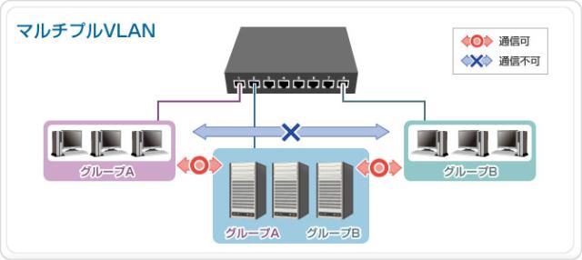 ポートベースVLAN / タグVLAN / マルチプルVLANなど、様々なVLAN機能に対応。強固なセキュリティを構築しながらフレキシブルなネットワーク活用を実現する事ができます。