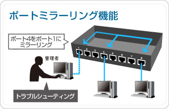特定のポートが送信または受信したパケットを、他のポートにコピー(ミラーリング)する事ができます。コピーしたデータを通過させるポートにパケットアナライザなどの監視用機器を接続することで、パケットの内容を監視する事ができます。