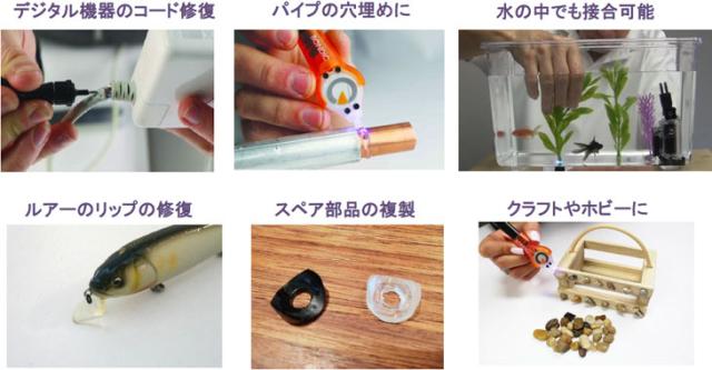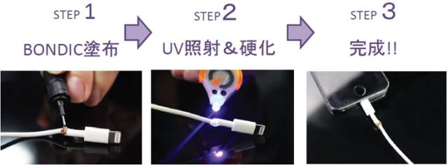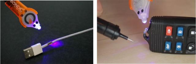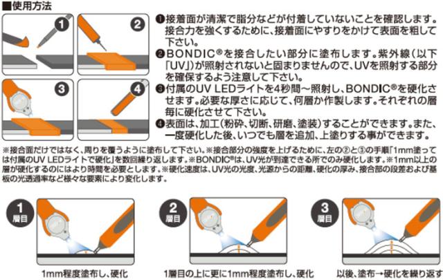 ■紫外線で硬化する液体プラスチックです。付属のBONDIC専用UVLEDライトで紫外線をたった4秒あてることで様々な素材を強力に接合することが出来ます。
