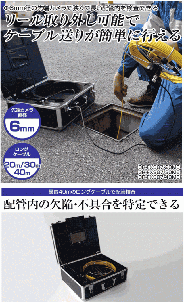 3RFXS0730M6 配管内の欠陥・不具合を設置したまま特定できる。7インチの大型モニタ。先端を破損から守るカメラガイド付属