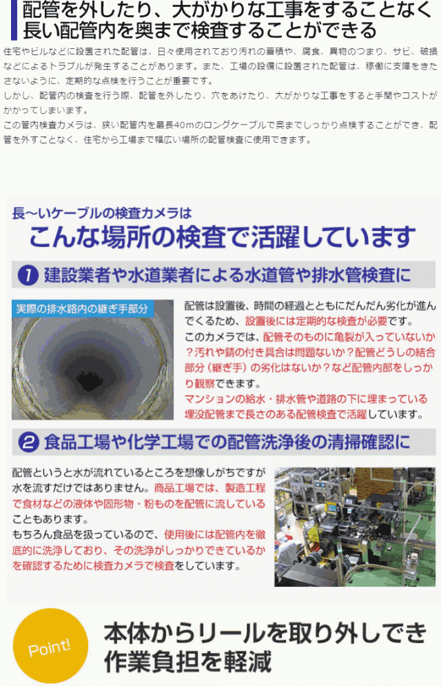 狭い配管内を最長40mのロングケーブルで奥までしっかり点検することができ、配管を外すことなく、住宅から工場まで幅広い場所の配管検査に使用できます