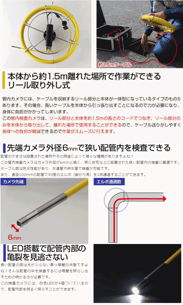 先端径Φ6mmで、狭い配管内を最長40mのロングケーブルで奥までしっかり点検することができ、配管を外すことなく、住宅から工場まで幅広い場所の配管検査に使用できます。