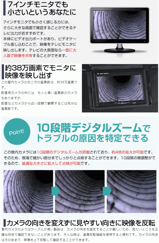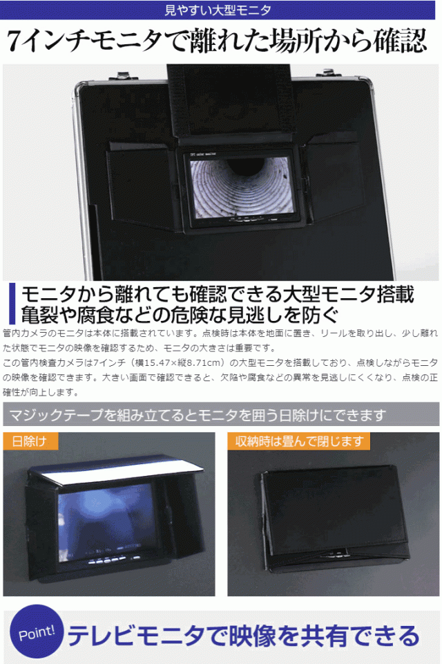 管内検査カメラは7インチ(横15.47×縦8.71cm)の大型モニタを搭載しているので離れた場所からでも画面をしっかり確認できます。