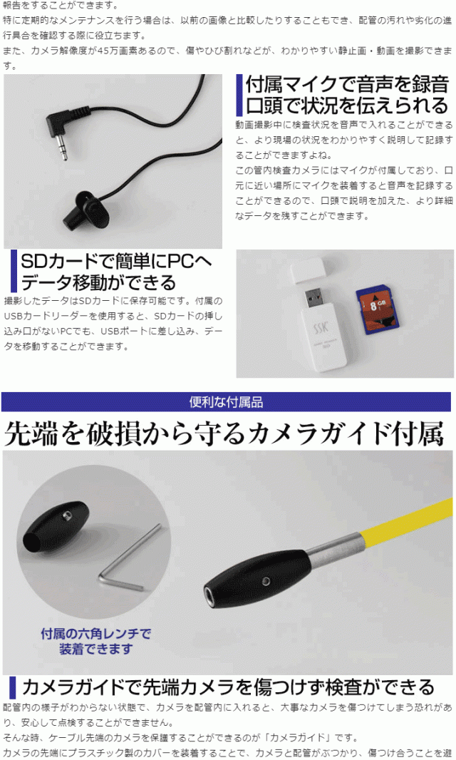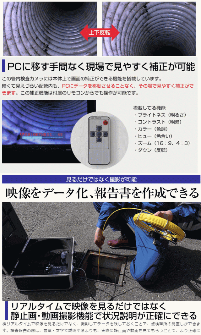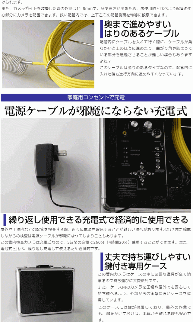 | 構成 | リール、4PIN接続ケーブル、カメラガイド、六角レンチ、リモコン、ツールボックスキー×2、交換用ヒューズ×2、SDHCカード、カードリーダー、ACアダプタ、マイク、取扱説明書、ツールボックス(モニタ/バッテリ/スイッチコンソール) |