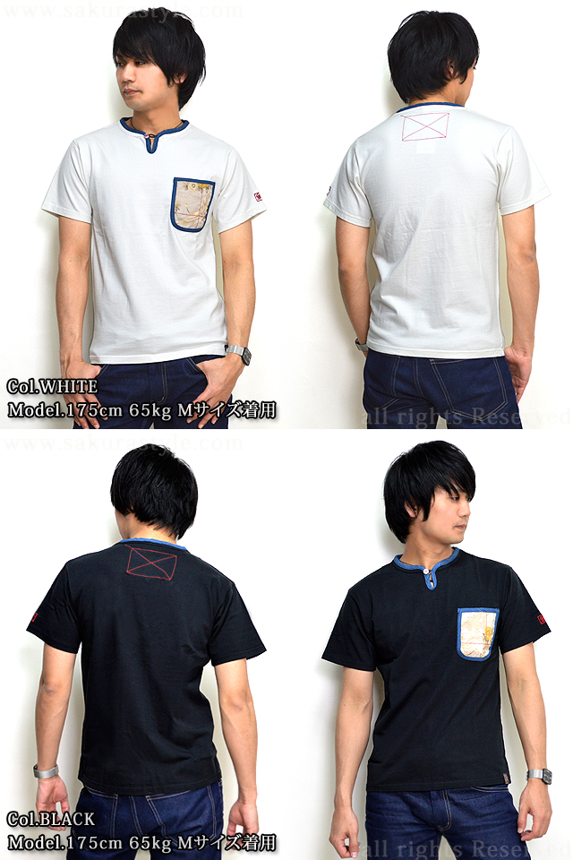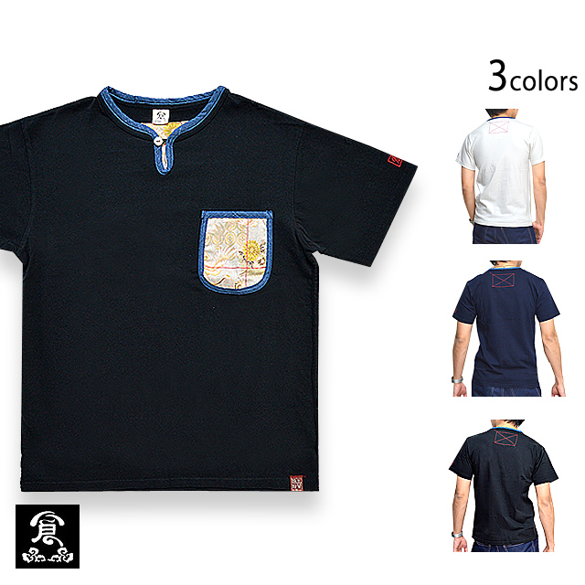 | 和を追求し、斬新且つ革新的なデザインで高い評価を受けている備中倉敷工房 倉さんから 「リメイク半袖Tシャツ(2)」のご紹介です。 シンプルなボディーに、和生地でリメイク加工を施し、着こなしに取り入れやすいTシャツを製作しました。 カラーも選べる3色!様々な場面で着用して頂ける1着です♪ 襟元は、1つボタンのヘンリーネックタイプ。 ループに通すタイプのボタンとなっております。 襟をぐるりと取り囲むように、異なる生地でパイピングを施し、デザインのアクセントに。 また、左胸に縫い付けられたポケットを縁取るように、同じ生地を使用しています。 ポケットには和生地を切り替えました。 菊鶴と菱紋柄の生地を使用しており、モチーフがちらりと顔を覗かせているのもポイント。 ポケットの和生地には、クロス状にステッチが施されています。 襟元のボタンには縮緬が被せられたボタンが使用されており、細かい部分にまで拘りが見受けられます。 左袖には、ブランドロゴを刺繍で落とし込みました。 バック、首後ろ辺りにも、ポケットに使用したものと同様のクロスステッチを、ワンポイントでデザインしています。 カラーは、ホワイト・インディゴ・ブラックの3色をご用意致しました。 どのカラーにも同じ色味で柄入れを施しているのですが、ボディーカラーが異なることによって、 それぞれ違った雰囲気を醸し出しています。 生地は、綿100%のさらりとした柔らかい肌触りのものを採用。 汗ばむ季節に気軽に着用して頂ける1着です。 首元がすっきり見えるヘンリーネックTシャツですので、1枚で着るのにはもちろん、 羽織物のインナーとして着用するのもオススメです♪ 切り替えのブルーの生地と、柄の入った和生地が、さりげなくシンプルな中に和を香らせてくれる1着。 普段和柄を着られない方にも是非オススメしたいTシャツです! | |||||||||||||||