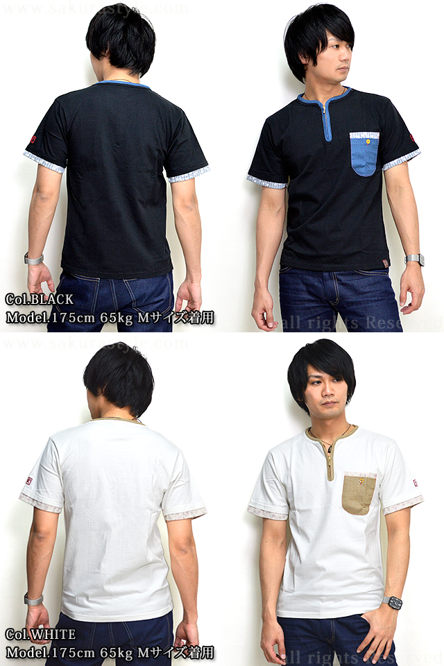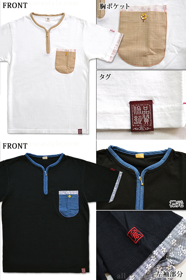 | 和を追求し、斬新且つ革新的なデザインで高い評価を受けている備中倉敷工房 倉さんから 「リメイク半袖Tシャツ(3)」のご紹介です。 シンプルなボディーに、和生地でリメイク加工を施し、着こなしに取り入れやすいTシャツを製作しました。 様々な場面で着用して頂ける1着です♪ 襟元には、ジップを取り付けた、Tシャツの中では少し珍しい仕様。 襟をぐるりと取り囲むように、異なる生地でパイピングを施し、デザインのアクセントに。 また、同様の生地を、左胸に縫い付けられたポケットの表面にも使用しています。 左胸には和柄と無地の2種類の生地で、ポケットが2重に重ねて取り付けられています。 Wポケット仕様で、手前のポケットにはボタンが付き、表面には縮緬が被せられたボタンが使用されています。 また、和柄生地は袖口にも縫い付けられており、フェイクレイヤード風に仕上げられています。 今回、和生地にはチェック柄をベースに細かい桜を組み合わせた柄のものを採用。 優しい色遣いの和生地を使用しているので、着こなしに取り入れやすいデザインに。 左袖には、ブランドロゴを刺繍で落とし込みました。 カラーは、ホワイトとブラックの2色をご用意致しました。 それぞれのボディーカラーに合わせて、用いる色味にも変化を持たせており、 無地部分は、ホワイトはベージュ、ブラックはブルー。 和生地部分は、ホワイトはナチュラル、ブラックは薄いブラックを使用しています。 生地は、綿100%のさらりとした柔らかい肌触りのものを採用。 汗ばむ季節に気軽に着用して頂ける1着です。 首元がすっきり見える仕様のTシャツなので、1枚で着るのにはもちろん、 羽織物のインナーとして着用するのもオススメです♪ 切り替えのブルーの生地と、柄の入った和生地が、さりげなくシンプルな中に和を香らせてくれる1着。 普段和柄を着られない方にも是非オススメしたいTシャツです! | ||||||||||