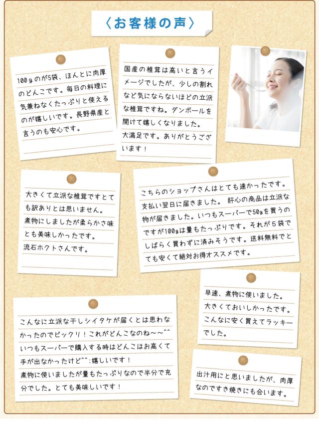 - しいたけが大好きで干したのは特に味が良いのでこれからお水で戻します。鶏肉等色々な物を入れて煮物を作ります。楽しみです。又購入したいです?