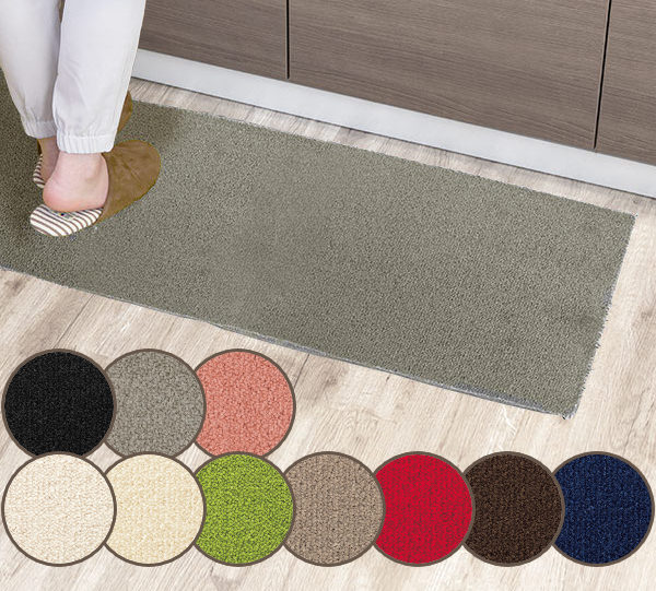 L字型や広めのキッチンなどでもぴったりサイズで作れる、オーダーキッチンマットです。選べるカラーは10種類。どんな床材にも合わせやすい色味なので、ベッドサイドや玄関、廊下などにもお使いいただけます。