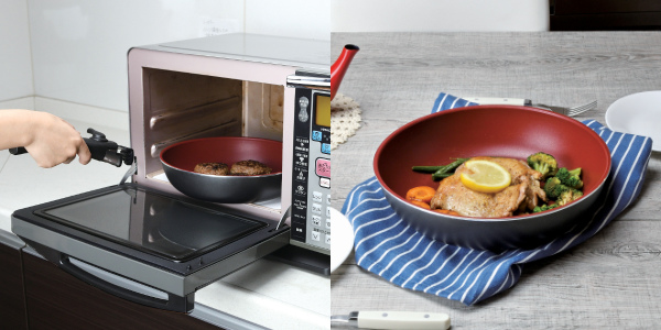 IH、ガス火、オーブン、オール熱源対応で、焼いて、煮て、炒めて、蒸して、オーブン調理まで、幅広い調理に対応できます。ハンドルを外すと、出来たてあつあつのお料理を食卓ヘ出すことができます。