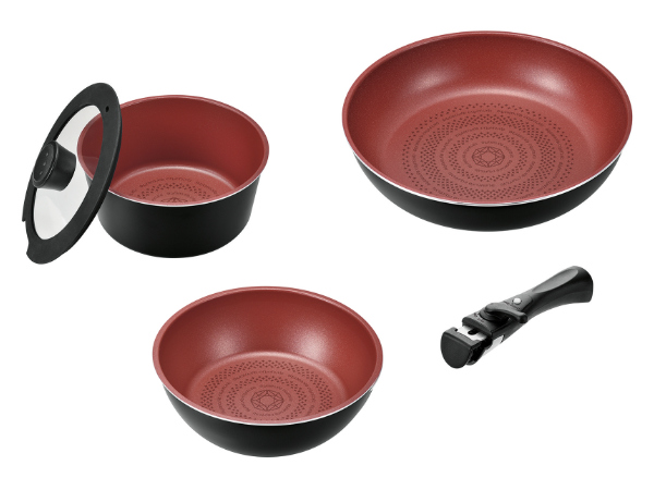 | 材質 | マルチポット・フライパン・いため鍋:アルミニウム合金、ステンレス鋼(内面:ふっ素樹脂加工 外面:焼き付け塗装) ガラス蓋:強化ガラス、シリコンゴム、フェノール樹脂、ナイロン ハンドル:フェノール樹脂、ナイロン、シリコンゴム、ABS樹脂、18-8ステンレス鋼 |