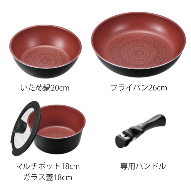 | 内容量 | 5点セット(マルチポット18cm、いため鍋20m、フライパン26cm、ガラス蓋18cm、専用ハンドル) |