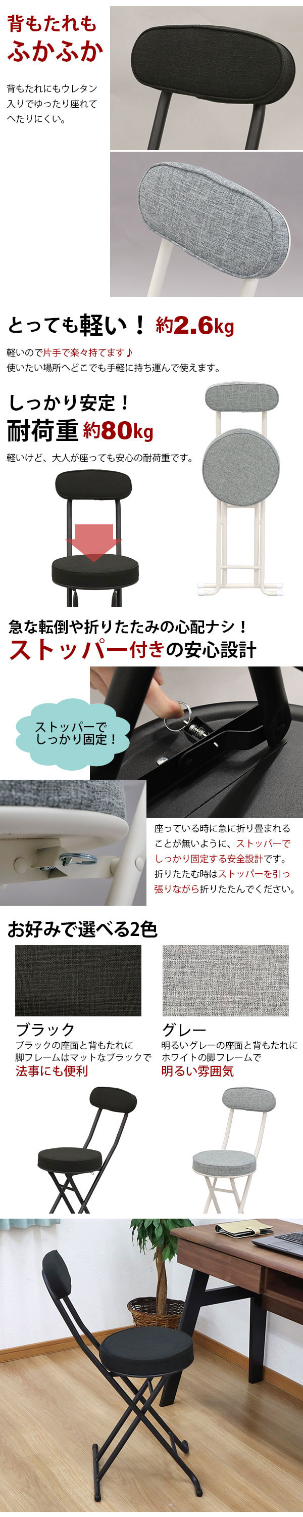 キッチンや台所作業用の椅子として活躍します。 来客時用の予備いす(予備用のイス)としても便利です。 ちょっとした腰掛け用のパイプ椅子としてもOK! 座面高さ 約48.5cm お手持ちのテーブルやデスクに合わせやすいチェアです。 背もたれ付きでゆったり座れます。 急な来客時の予備椅子や人が多く集まる場所にも便利です。 お好みで選べる2色 ブラックの座面と背もたれに脚フレームはマットなブラックで法事にも便利 グレー 明るいグレーの座面と背もたれにホワイトの脚フレームで明るい雰囲気 |