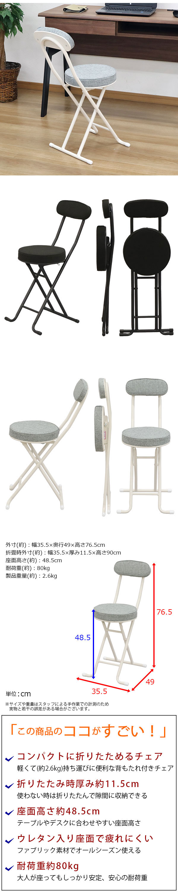 外寸(約):幅35.5×奥行49×高さ76.5cm 折畳時外寸(約):幅35.5×厚み11.5×高さ90cm 座面高さ(約):48.5cm |