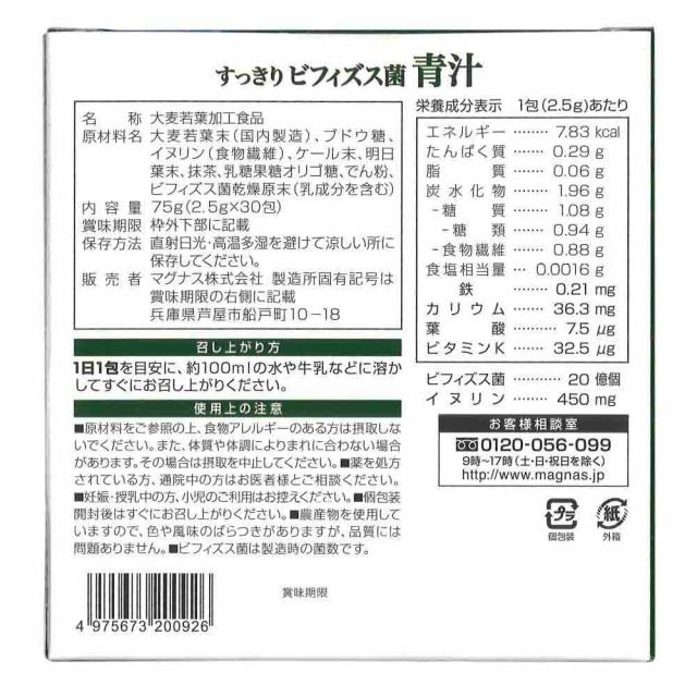 (1包(2.5gあたり) ビフィズス菌 20億個、イヌリン 450mg、食物繊維 0.88g、鉄 0.21mg、カリウム 36.3mg、葉酸 7.5μg、ビタミンK 32.5μg