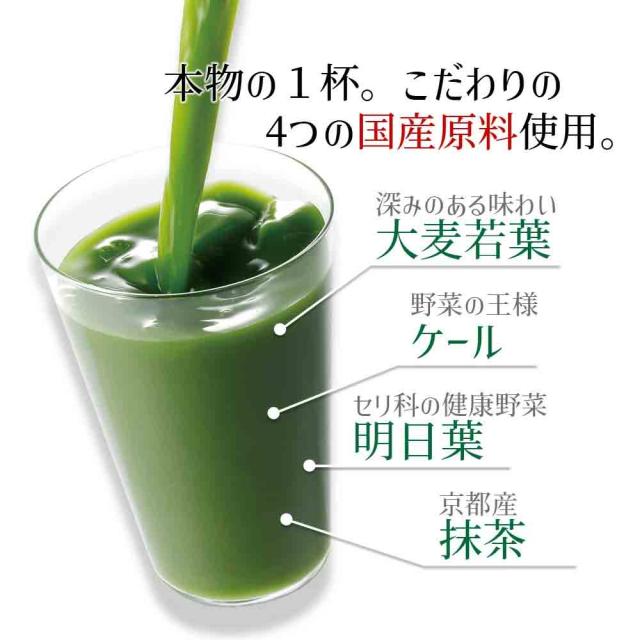 ●【国産原料100%使用】3種類の国産素材「大麦若葉(九州産)・ケール(山口県産)・明日葉(山口県産)」に、宇治抹茶、ビフィズス菌、イヌリン(食物繊維)、オリゴ糖を配合した、すっきりサポートにこだわった青汁です。