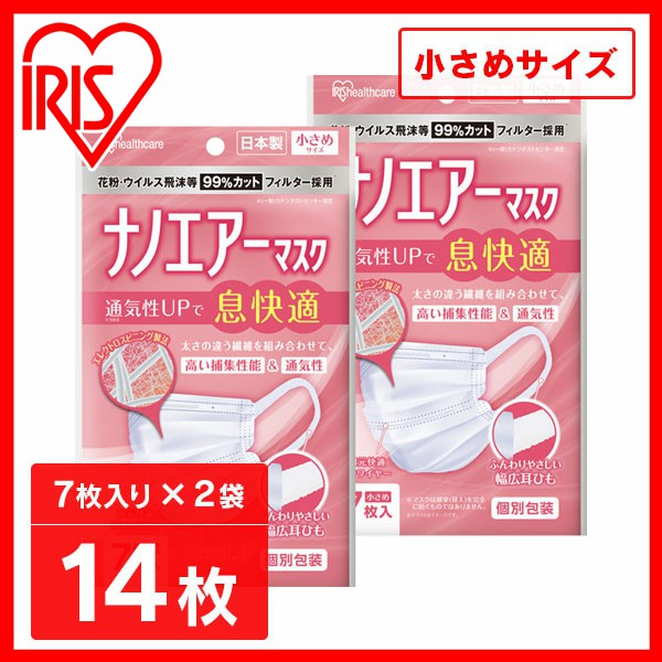 【2個セット】ナノエアーマスク 小さめサイズ 7枚入 PK-NI7S マスク 使い捨て 7枚入り 小さめサイズ 小さい 女性 子供 個別包装 飛沫予防 ウイルス予防 感染症予防 花粉 風邪 ハウスダスト 痛くなりにくい アイリスオーヤマ