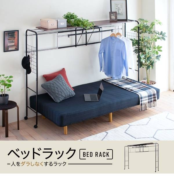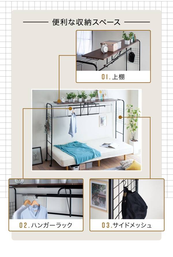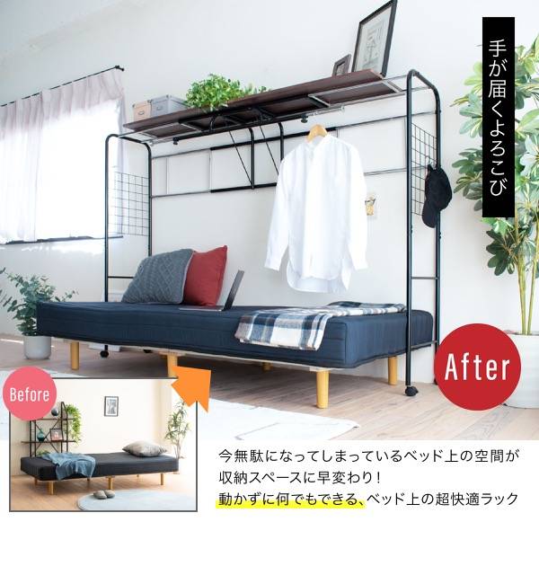 無駄になってしまうベッド上の空間をハンガーラックや上棚などで有効活用できます。